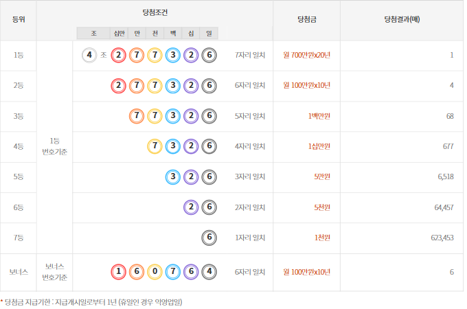 1등(7자리 일치): 4 조 277326 — 월 700만원 x 20년, 1명