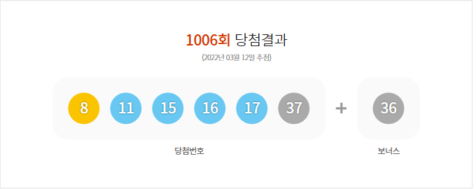 (2022년 03월 12일 추첨) 1006회 로또 당첨 결과가 8,11,15,16,17,37 보너스 36로 결정 및 1006회 (2022년 03월 12일 추첨)추첨 결과, 총 금액104,542,431,000원 판매되었다.