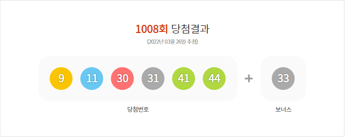 (2022년 03월 26일 추첨) 1008회 로또 당첨 결과가 9,11,30,31,41,44 보너스 33로 결정 및 1008회 (2022년 03월 26일 추첨)추첨 결과, 총 금액103,727,042,000원 판매되었다.