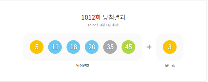 (2022년 04월 23일 추첨) 1012회 로또 당첨 결과가 5,11,18,20,35,45 보너스 3로 결정 및 1012회 (2022년 04월 23일 추첨)추첨 결과, 총 금액101,948,323,000원 판매되었다.