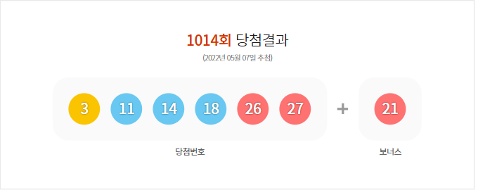 (2022년 05월 07일 추첨) 1014회 로또 당첨 결과가 3,11,14,18,26,27 보너스 21로 결정 및 1014회 (2022년 05월 07일 추첨)추첨 결과, 총 금액102,396,369,000원 판매되었다.
