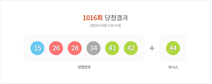 (2022년 05월 21일 추첨) 1016회 로또 당첨 결과가 15,26,28,34,41,42 보너스 44로 결정 및 1016회 (2022년 05월 21일 추첨)추첨 결과, 총 금액101,583,153,000원 판매되었다.