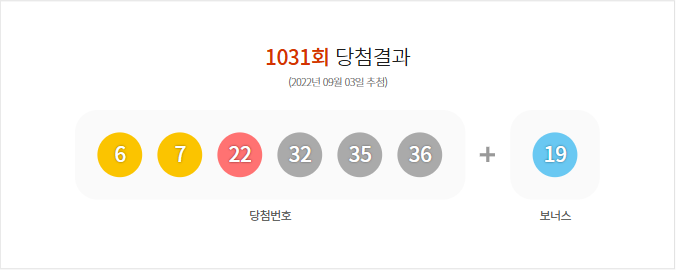 (2022년 09월 03일 추첨) 1031회 로또 당첨 결과가 6,7,22,32,35,36 보너스 19로 결정 및 1031회 (2022년 09월 03일 추첨)추첨 결과, 총 금액104,316,078,000원 판매되었다.
