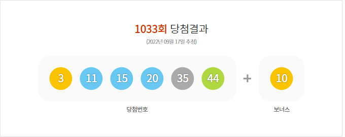 (2022년 09월 17일 추첨) 1033회 로또 당첨 결과가 3,11,15,20,35,44 보너스 10로 결정 및 1033회 (2022년 09월 17일 추첨)추첨 결과, 총 금액104,642,258,000원 판매되었다.