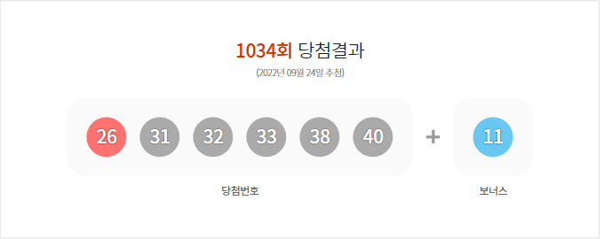 (2022년 09월 24일 추첨) 1034회 로또 당첨 결과가 26,31,32,33,38,40 보너스 11로 결정 및 1034회 (2022년 09월 24일 추첨)추첨 결과, 총 금액107,150,089,000원 판매되었다.