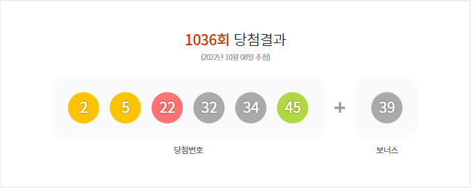(2022년 10월 08일 추첨) 1036회 로또 당첨 결과가 2,5,22,32,34,45 보너스 39로 결정 및 1036회 (2022년 10월 08일 추첨)추첨 결과, 총 금액103,753,936,000원 판매되었다.