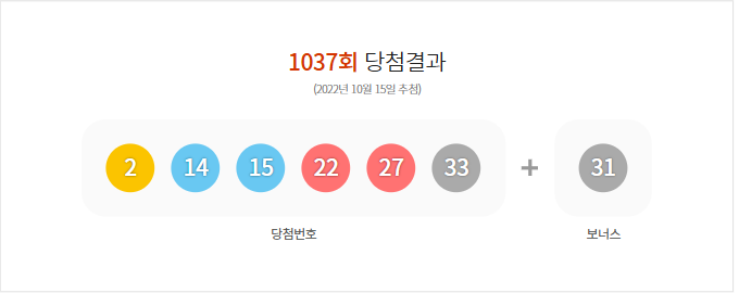 (2022년 10월 15일 추첨) 1037회 로또 당첨 결과가 2,14,15,22,27,33 보너스 31로 결정 및 1037회 (2022년 10월 15일 추첨)추첨 결과, 총 금액104,840,173,000원 판매되었다.
