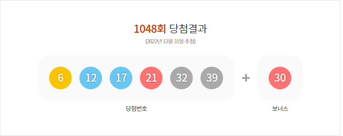 (2022년 12월 31일 추첨) 1048회 로또 당첨 결과가 6,12,17,21,32,39 보너스 30로 결정 및 1048회 (2022년 12월 31일 추첨)추첨 결과, 총 금액117,323,901,000원 판매되었다.