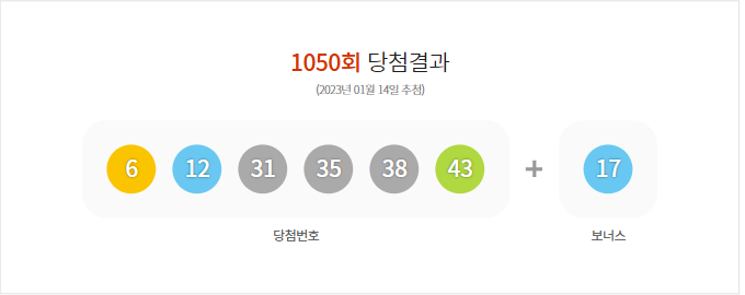 (2023년 01월 14일 추첨) 1050회 로또 당첨 결과가 6,12,31,35,38,43 보너스 17로 결정 및 1050회 (2023년 01월 14일 추첨)추첨 결과, 총 금액108,072,602,000원 판매되었다.