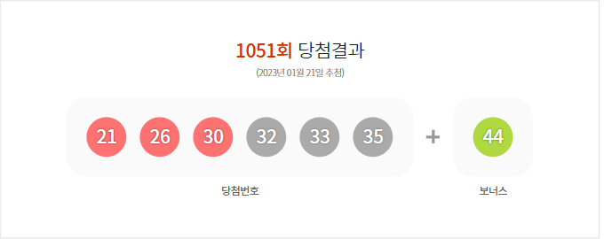 (2023년 01월 21일 추첨) 1051회 로또 당첨 결과가 21,26,30,32,33,35 보너스 44로 결정 및 1051회 (2023년 01월 21일 추첨)추첨 결과, 총 금액119,243,907,000원 판매되었다.