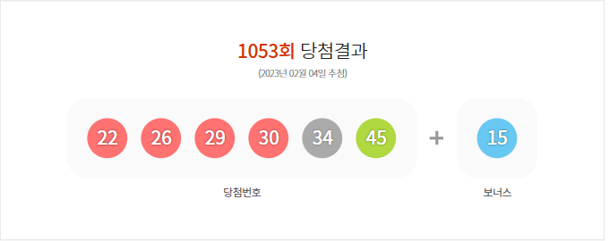 (2023년 02월 04일 추첨) 1053회 로또 당첨 결과가 22,26,29,30,34,45 보너스 15로 결정 및 1053회 (2023년 02월 04일 추첨)추첨 결과, 총 금액113,721,665,000원 판매되었다.