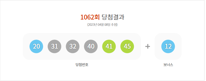 (2023년 04월 08일 추첨) 1062회 로또 당첨 결과가 20,31,32,40,41,45 보너스 12로 결정 및 1062회 (2023년 04월 08일 추첨)추첨 결과, 총 금액107,109,911,000원 판매되었다.