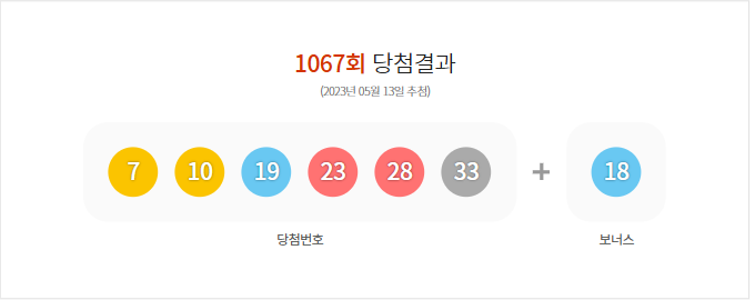 (2023년 05월 13일 추첨) 1067회 로또 당첨 결과가 7,10,19,23,28,33 보너스 18로 결정 및 1067회 (2023년 05월 13일 추첨)추첨 결과, 총 금액110,703,299,000원 판매되었다.