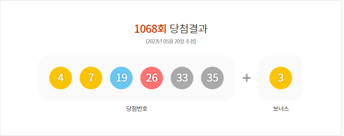 (2023년 05월 20일 추첨) 1068회 로또 당첨 결과가 4,7,19,26,33,35 보너스 3로 결정 및 1068회 (2023년 05월 20일 추첨)추첨 결과, 총 금액108,988,932,000원 판매되었다.