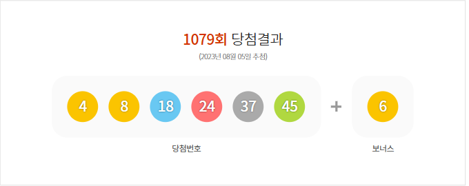 (2023년 08월 05일 추첨) 1079회 로또 당첨 결과가 4,8,18,24,37,45 보너스 6로 결정 및 1079회 (2023년 08월 05일 추첨)추첨 결과, 총 금액103,120,206,000원 판매되었다.