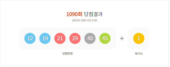 (2023년 10월 21일 추첨) 1090회 로또 당첨 결과가 12,19,21,29,40,45 보너스 1로 결정 및 1090회 (2023년 10월 21일 추첨)추첨 결과, 총 금액108,364,862,000원 판매되었다.