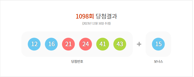 (2023년 12월 16일 추첨) 1098회 로또 당첨 결과가 12,16,21,24,41,43 보너스 15로 결정 및 1098회 (2023년 12월 16일 추첨)추첨 결과, 총 금액103,850,339,000원 판매되었다.