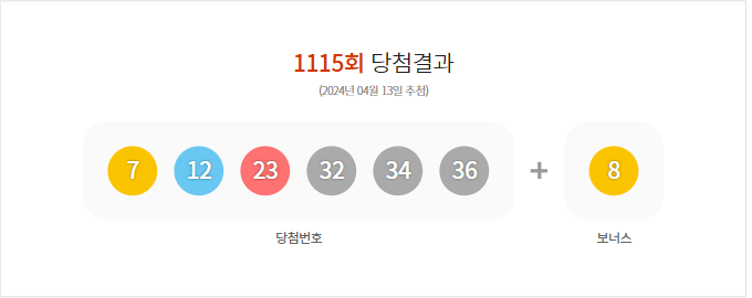 (2024년 04월 13일 추첨) 1115회 로또 당첨 결과가 7,12,23,32,34,36 보너스 8로 결정 및 1115회 (2024년 04월 13일 추첨)추첨 결과, 총 금액113,939,215,000원 판매되었다.