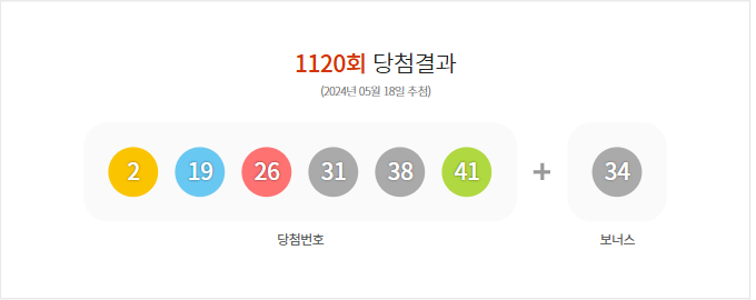 (2024년 05월 18일 추첨) 1120회 로또 당첨 결과가 2,19,26,31,38,41 보너스 34로 결정 및 1120회 (2024년 05월 18일 추첨)추첨 결과, 총 금액114,804,359,000원 판매되었다.