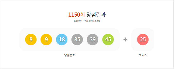 (2024년 12월 14일 추첨) 1150회 로또 당첨 결과가 8,9,18,35,39,45 보너스 25로 결정 및 1150회 (2024년 12월 14일 추첨)추첨 결과, 총 금액114,152,034,000원 판매되었다.