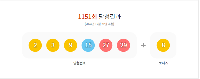 (2024년 12월 21일 추첨) 1151회 로또 당첨 결과가 2,3,9,15,27,29 보너스 8로 결정 및 1151회 (2024년 12월 21일 추첨)추첨 결과, 총 금액116,118,444,000원 판매되었다.
