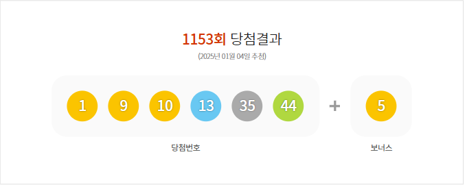 (2025년 01월 04일 추첨) 1153회 로또 당첨 결과가 1,9,10,13,35,44 보너스 5로 결정 및 1153회 (2025년 01월 04일 추첨)추첨 결과, 총 금액126,343,367,000원 판매되었다.