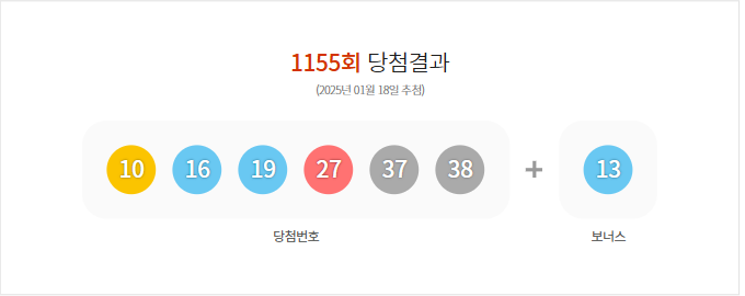 (2025년 01월 18일 추첨) 1155회 로또 당첨 결과가 10,16,19,27,37,38 보너스 13로 결정 및 1155회 (2025년 01월 18일 추첨)추첨 결과, 총 금액118,482,730,000원 판매되었다.