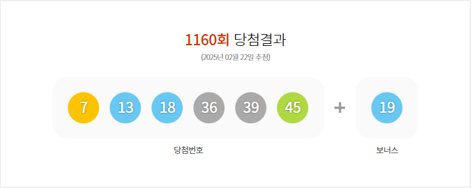 (2025년 02월 22일 추첨) 1160회 로또 당첨 결과가 7,13,18,36,39,45 보너스 19로 결정 및 1160회 (2025년 02월 22일 추첨)추첨 결과, 총 금액123,177,536,000원 판매되었다.
