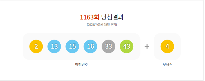(2025년 03월 15일 추첨) 1163회 로또 당첨 결과가 2,13,15,16,33,43 보너스 4로 결정 및 1163회 (2025년 03월 15일 추첨)추첨 결과, 총 금액122,246,316,000원 판매되었다.