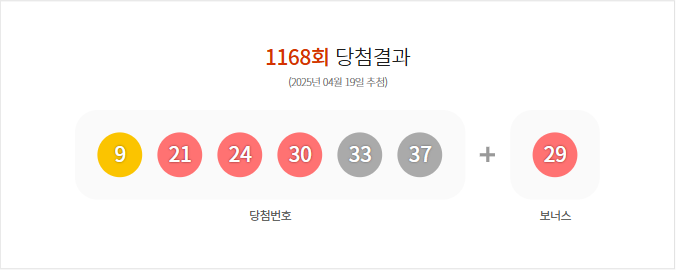 (2025년 04월 19일 추첨) 1168회 로또 당첨 결과가 9,21,24,30,33,37 보너스 29로 결정 및 1168회 (2025년 04월 19일 추첨)추첨 결과, 총 금액117,811,795,000원 판매되었다.