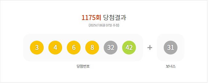 (2025년 06월 07일 추첨) 1175회 로또 당첨 결과가 3,4,6,8,32,42 보너스 31로 결정 및 1175회 (2025년 06월 07일 추첨)추첨 결과, 총 금액117,488,305,000원 판매되었다.