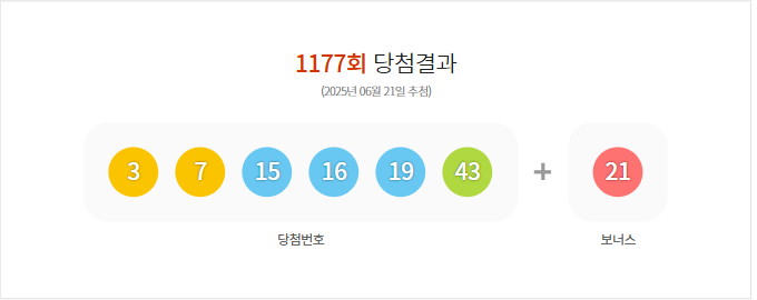 (2025년 06월 21일 추첨) 1177회 로또 당첨 결과가 3,7,15,16,19,43 보너스 21로 결정 및 1177회 (2025년 06월 21일 추첨)추첨 결과, 총 금액115,411,832,000원 판매되었다.