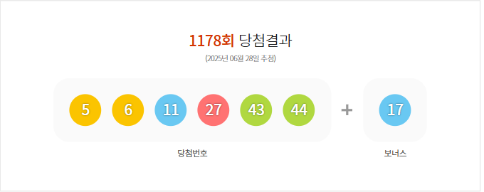 (2025년 06월 28일 추첨) 1178회 로또 당첨 결과가 5,6,11,27,43,44 보너스 17로 결정 및 1178회 (2025년 06월 28일 추첨)추첨 결과, 총 금액118,774,279,000원 판매되었다.