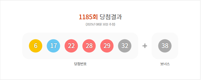 (2025년 08월 16일 추첨) 1185회 로또 당첨 결과가 6,17,22,28,29,32 보너스 38로 결정 되었으며, 총 판매 금액은 117,480,804,000원 입니다.