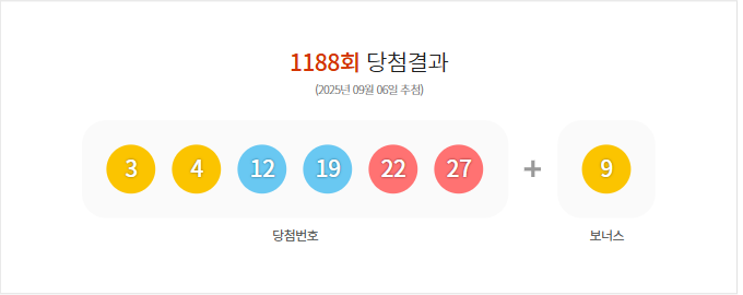 (2025년 09월 06일 추첨) 1188회 로또 당첨 결과가 3,4,12,19,22,27 보너스 9로 결정 되었으며, 총 판매 금액은 116,617,971,000원 입니다.