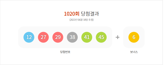 (2022년 06월 18일 추첨) 1020회 로또 당첨 결과가 12,27,29,38,41,45 보너스 6로 결정 되었으며, 총 판매 금액은 104,996,396,000원 입니다.