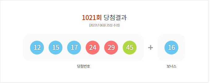 (2022년 06월 25일 추첨) 1021회 로또 당첨 결과가 12,15,17,24,29,45 보너스 16로 결정 되었으며, 총 판매 금액은 101,960,162,000원 입니다.