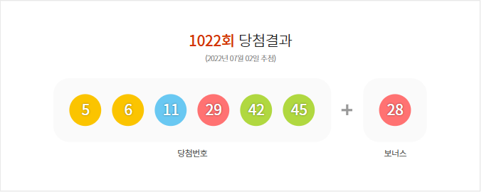 (2022년 07월 02일 추첨) 1022회 로또 당첨 결과가 5,6,11,29,42,45 보너스 28로 결정 되었으며, 총 판매 금액은 99,233,031,000원 입니다.
