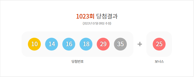 (2022년 07월 09일 추첨) 1023회 로또 당첨 결과가 10,14,16,18,29,35 보너스 25로 결정 되었으며, 총 판매 금액은 100,399,659,000원 입니다.