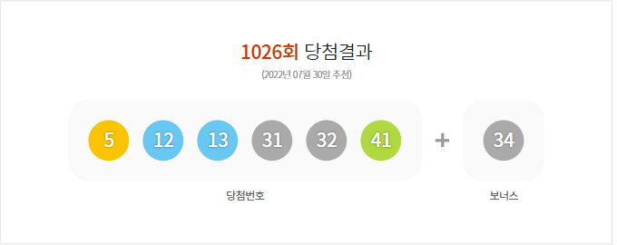(2022년 07월 30일 추첨) 1026회 로또 당첨 결과가 5,12,13,31,32,41 보너스 34로 결정 되었으며, 총 판매 금액은 101,556,379,000원 입니다.