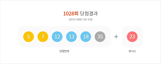 (2022년 08월 13일 추첨) 1028회 로또 당첨 결과가 5,7,12,13,18,35 보너스 23로 결정 되었으며, 총 판매 금액은 100,613,537,000원 입니다.