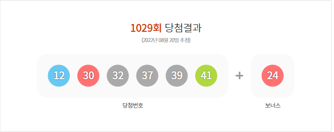 (2022년 08월 20일 추첨) 1029회 로또 당첨 결과가 12,30,32,37,39,41 보너스 24로 결정 되었으며, 총 판매 금액은 101,336,312,000원 입니다.